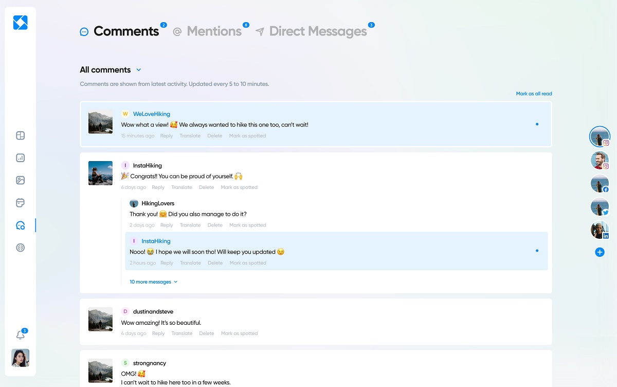 L’outil se caractérise aussi par sa fonctionnalité de social listening avancée : vous gardez un œil sur l’activité de vos concurrents sur les médias sociaux et vous surveillez ce qui se dit sur votre marque (hashtags et mentions). Ces données vous aideront à mieux comprendre ce qui fonctionne et quelles sont les publications que vous pourriez optimiser. Autre avantage : vous identifiez rapidement les commentaires ainsi que les mentions non-lus en attente de modération, et vous y répondez en un clic directement depuis la plateforme.