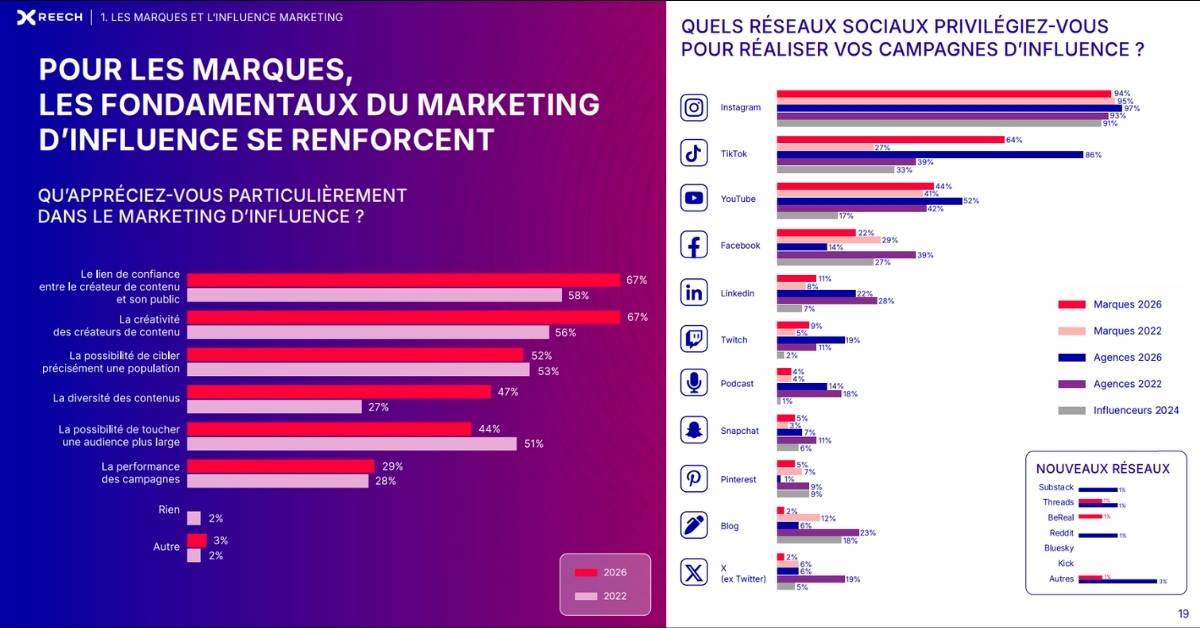 L’influence marketing continue de gagner du terrain en France, selon Reech, portée par Instagram et TikTok, même si des freins budgétaires et internes subsistent.