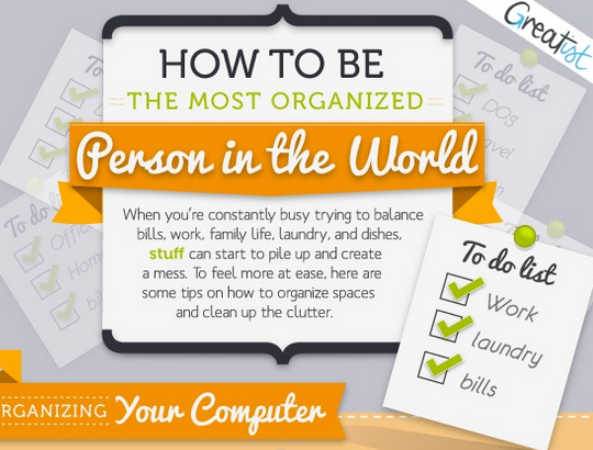 Cette infographie a regroupé de nombreuses astuces de différents sites (LifeHacker, Mashable, PCMag, …) pour de nombreux aspects de votre vie. Internet et l’informatique pour commencer. Ranger son bureau sera la première priorité, de même que bien classer ses fichiers, synchroniser ses documents sur ses différents appareils ou trier ses mails. De nombreux services sont suggérés, comme Wunderlist pour les todolists, Dropbox pour l’hébergement de fichiers, Hootsuite pour Twitter… A vous de choisir ! L’agencement de votre maison, de votre cuisine ou de votre salle de bain sont également abordés.