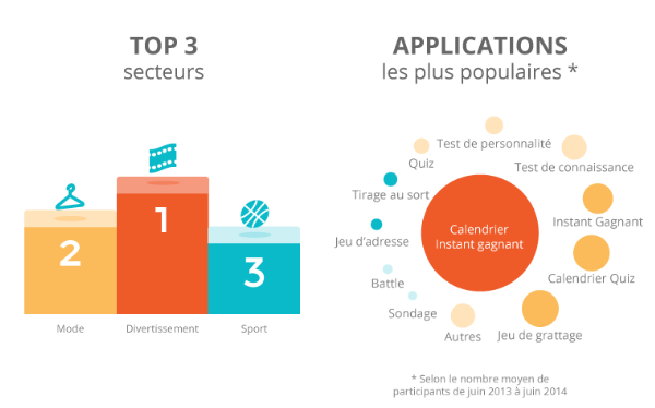 L’infographie du jour s’intéresse à ce domaine particulier en vous présentant un certain nombre de chiffres et de données sur les jeux concours en ligne. Elle est réalisée par Kontest, un outil dont nous avions déjà eu l’occasion de vous parler. On y apprend que la musique est la catégorie de dotation la plus populaire devant les voyages, que le lot moyen offert coûte 169 euros, que le nombre de participants par tablettes et smartphones ont été multiplié respectivement par 4 et par 3 l’année dernière ou encore que le meilleur mois pour lancer un concours est novembre. Intéressant avant de se lancer !