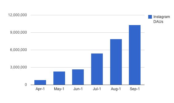 Alors que l’application n’avait que 860 000 utilisateurs réguliers en avril dernier, elle en a maintenant plus de 11 millions, selon les chiffres du mois de septembre. Nous parlons bien d’utilisateurs actifs quotidiens (daily active users, DAU) et non du nombre total de membres. Nous devons ces chiffres à AppData, qui livre régulièrement les statistiques des applications mobiles sur toutes les plateformes. On constate donc une très nette progression de 1179% en 6 mois. Progression que l’on doit notamment à l’arrivée d’Instagram sur Android en avril et qui a entraîné une hausse substantielle dans les mois qui ont suivi. La semaine suivante, Facebook achète l’application pour 1 milliard de dollars. Les avis sont mitigés et certains craignent qu’Instagram n’y perde son identité. Les chiffres ont donc augmenté avec l’arrivée des utilisateurs Android mais se sont stabilisés pendant deux mois. Dés juillet, le nombre d’utilisateurs réguliers augmente de 2 à 3 millions chaque mois.