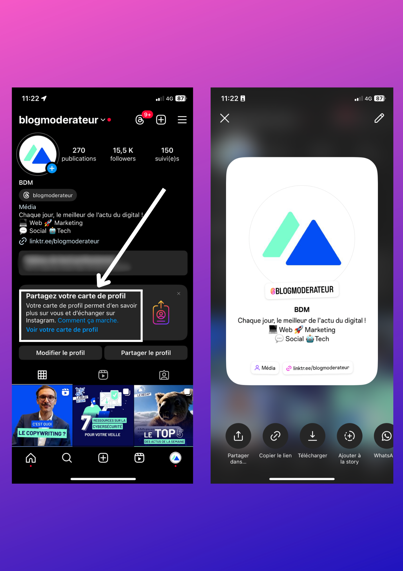 Si vous utilisez Instagram comme une plateforme pour mettre en avant votre entreprise, cette nouvelle fonctionnalité devrait vous être utile. Il est désormais possible de créer une carte de présentation pour votre profil et ainsi le partager de manière plus originale. Vous pouvez partager votre carte sur les différents réseaux sociaux et même l’intégrer à votre site web. La carte dispose d’un QR code que les gens peuvent scanner pour accéder à votre profil Instagram, mais vous avez aussi la possibilité d’ajouter des liens externes vers d’autres produits que vous désirez promouvoir comme votre boutique en ligne ou votre site web.