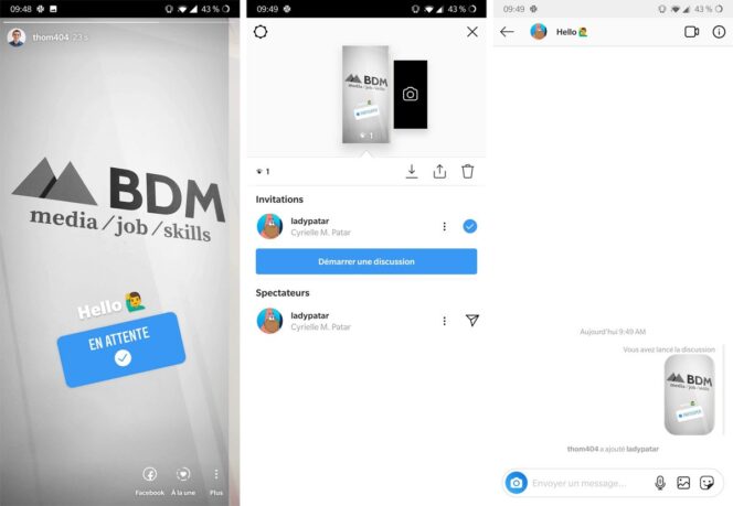 Vous êtes prêt ? Vous n’avez plus qu’à lancer la discussion : pour ce faire, retournez sur votre story et faites un swipe vers le haut (comme pour voir qui a vu votre story). Vous verrez les personnes ayant demandé à rejoindre votre discussion. Vous pouvez enlever les personnes que vous ne souhaitez pas inviter, puis cliquer sur Démarrer la discussion. Tous les participants pourront alors discuter ensemble sur Instagram.