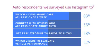Les résultats du secteur sont basés sur l’étude du comportement de 1600 fans d’automobile sur Instagram, identifiés par leurs hashtags et leurs abonnements. On apprend ainsi que 70 % des « auto-enthousiasts » sont des hommes. L’étude nous informe que les amateurs de voitures utilisent la plateforme pour trouver des photos de modèles rares ou échanger avec d’autres fans de la communauté. Ils apprécient également les contenus qui montrent les véhicules en action. 83% d’entre eux regardent en effet des vidéos d’autos au moins une fois par semaine.