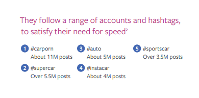 Au niveau des hashtags, les plus utilisés tournent autour du l’aspect visuel : #carporn, #supercar, #auto, #instacar, #sportscar… Ils témoignent d’une vraie volonté de la communauté de consulter des clichés de modèles attractifs et onéreux.