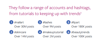 Le secteur de la beauté est essentiel sur le réseau social. L’étude nous apprend en effet que plus de 160 millions de posts Instagram contiennent le hashtag #beauty. Aux USA, plus de 13 millions d’utilisateurs ont mentionné la beauté et les cosmétiques dans leurs passions favorites. L’audience majoritaire est féminine, les femmes sont 76 % contre 24 % d’hommes à suivre ce secteur. Ces abonnés utilisent Instagram majoritairement pour trouver de l’inspiration. Ils se sentent de plus en plus confiants grâce aux pratiques et autres astuces trouvées sur la plateforme. Les tutoriels y sont très populaires, les fans du secteur apprécient là aussi le fait d’être connectés aux personnes qui partagent leur intérêt. Cette tendance se confirme quand on regarde les hashtags « beauté » les plus utilisés.