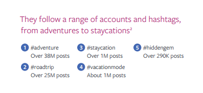 Paradoxalement un des hashtags les plus utilisés est #staycation, l’équivalent de rester à la maison, avec plus d’un million de posts. Il arrive en 3ème position derrière #adventure (38 millions de posts) et #roadtrip (25 millions de posts).