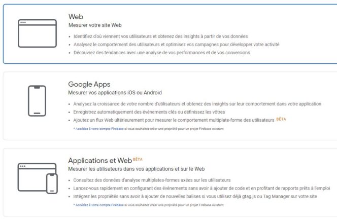 Dans notre cas, nous avons sélectionné la première option qui concerne l’analyse d’un site web. L’étape suivante vous demande de saisir le nom et l’URL de votre site et d’indiquer votre secteur d’activité (finance, voyages, internet et télécoms, sports, etc.). Une fois les champs saisis, vous pouvez cliquer sur le bouton Créer.