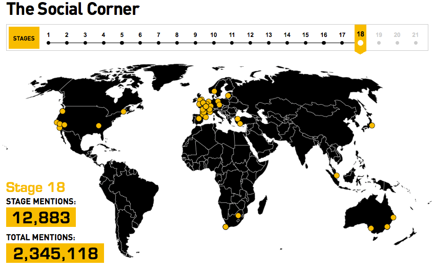 Cette année nous avons enrichi cette couverture Twitter avec un Social Corner sur www.letour.fr/socialcorner, un module data agrégeant en direct sur une carte du monde l’ensemble des tweets postés sur @letour ainsi qu’un mode « battle » comparant minute par minute lors de chaque étape des 10 coureurs et des 10 équipes les plus mentionnés sur Twitter.