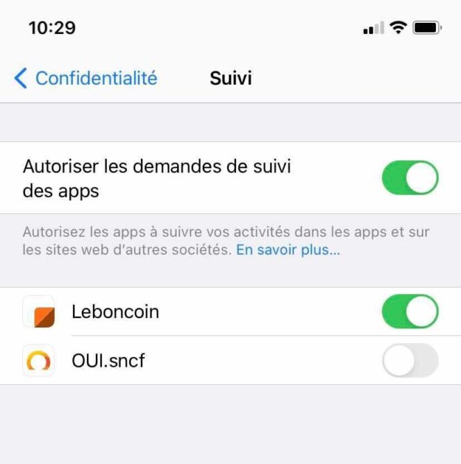 Si vous donnez l’autorisation à l’application, celle-ci pourra suivre ou accéder à l’identifiant publicitaire de votre appareil, appelé IDFA (Identifier for Advertisers), ce qui signifie qu’elle pourra vous proposer des publicités personnalisées sur d’autres applications ou sites web. Si vous refusez, son ciblage publicitaire sera alors réduit.