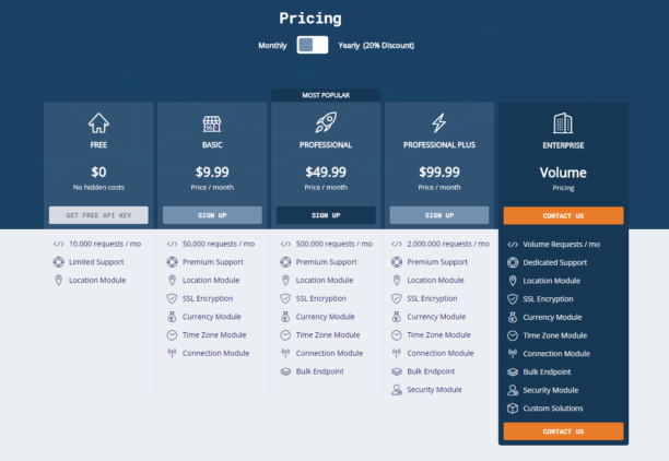 Au niveau de la tarification, ipstack dispose d’une formule gratuite et de 3 plans payants (9.99$, 49.99$ et 99.99$) qui proposent des fonctionnalités diverses en fonction de la taille de votre entreprise et de ses besoins. Pour les grosses entités, la société propose également de créer une formule entièrement personnalisée sur demande.