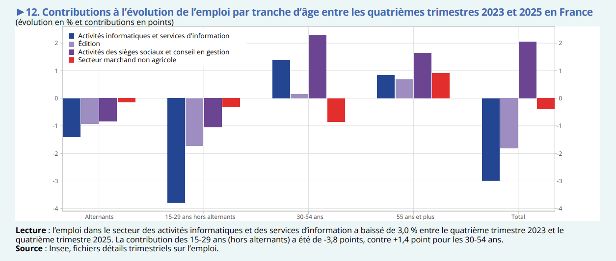Une note de conjoncture de l’Insee, publiée par Raphaële Adjerad et Gaston Vermersch le 24 mars 2026, montre que l’emploi salarié dans les activités informatiques et les services d’information a reculé de 3 % en France, entre fin 2023 et fin 2025. Ce recul est porté principalement par les 15-29 ans (hors alternants), qui contribuent pour -3,8 points à cette baisse, selon l’Institut national de la statistique et des études économiques. Dans le même temps, la contribution des 30-54 ans augmente de 1,4 point sur la même période (voir le graphique de une).