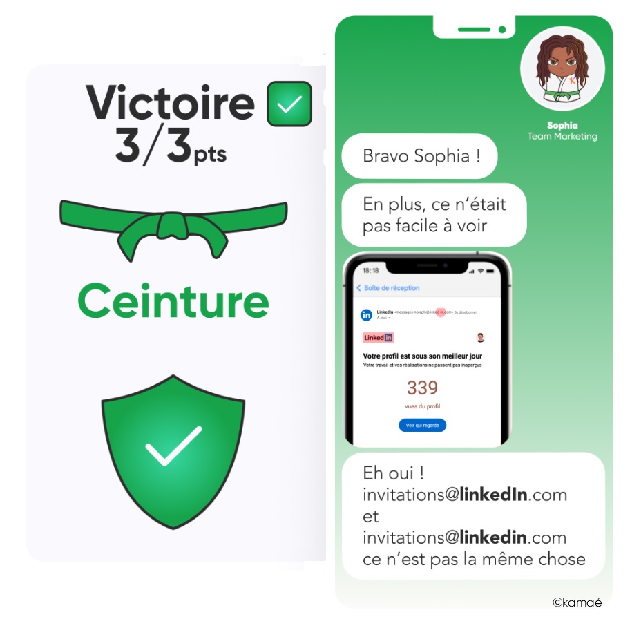 Pour la plateforme Kamaé, les mécaniques de gamification déployées sont le gain de points, l’obtention de ceintures, des challenges à relever, la possibilité de comparer son niveau pour les plus compétitifs, etc. Les objectifs pédagogiques : savoir reconnaître un piège tendu par un hacker en temps réel, esquiver une attaque et ne pas paniquer en cas d’incident, pour in fine décourager l’adversaire. En effet, les hackers s’attaquent aux « ceintures blanches de cybersécurité », les collaborateurs les plus vulnérables, pour s’infiltrer dans un système d’information à moindre effort.
