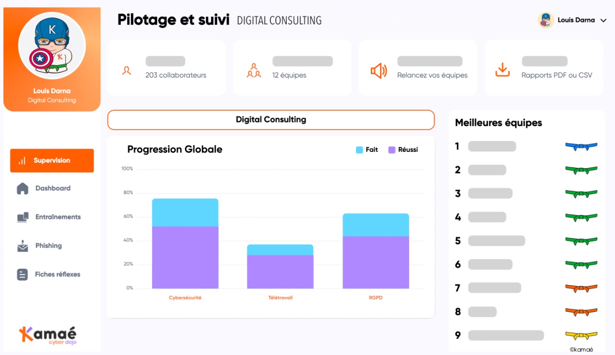 Kamaé est un terme japonais emprunté aux arts martiaux, qui signifie « la garde ». Le but de la solution Kamaé : mettre en garde les collaborateurs contre les cybermenaces, en développant leurs réflexes via une approche gamifiée. Ils sont invités à s’entraîner dans le « cyber dojo » pour passer leurs ceintures de cybersécurité, RGPD et de télétravail. La plateforme offre une expérience plus attractive et agréable par le jeu, ce qui augmente la motivation des utilisateurs, améliore les taux d’engagement et de rétention des messages. L’interface de Kamaé est simple d’utilisation et engageante, ce qui rend la sensibilisation aux risques cyber plus accessible aux organisations comme aux collaborateurs.