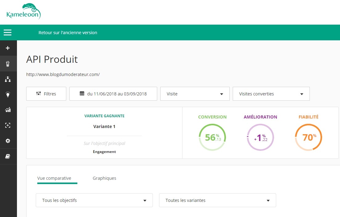 Une fois le tag installé, et le test paramétré, vous pouvez analyser les résultats de vos différents tests. L’analyse des résultats peut se faire en temps réel sur le dashboard Kameleoon. Ce dernier est particulièrement pragmatique à appréhender et regroupe toutes vos campagnes.