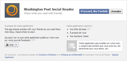 Les médias ont rapidement tiré profit de ces nouveautés, en lançant des Social readers : des applications permettant, entre autres, de partager automatiquement sur Facebook les articles que vous êtes en train de consulter. Le problème, c’est qu’il est facile d’oublier que l’on a accordé tel ou tel droit à une application, et de se retrouver avec toutes ses lectures à la vue de tous sur Facebook, sans qu’on l’ait forcément cherché. On voit bien les avantages pour les éditeurs et pour Facebook : la promesse d’une visibilité accrue pour les uns, et les fondations d’une plateforme allant au-delà du simple réseautage social pour l’autre. Mais ce qui devait être un apporteur de trafic conséquent pour les médias en ligne a-t-il fini par ennuyer les membres de Facebook ?