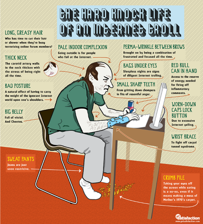 Les trolls : on en rencontre assez fréquemment dans nos contrées blogosphériques. Personnages appartenant à la mythologie de l’Internet, ils sévissent dans les commentaires ou sur les forums, déversant leur mécontentement et leur manque d’argumentation un peu partout. Et contre eux, c’est difficile de faire quoi que ce soit ! La sagesse populaire indique : « Don’t feed the troll », c’est-à-dire ne pas les nourrir, ne pas leur répondre pour leur donner du grain à moudre. Mais à quoi ressemble un troll dans la vraie vie ? Cette infographie nous l’apprend : cheveux sales, rides dues à la frustration, mine patibulaire, cernes à cause du manque de sommeil… Le troll n’a pas l’air vraiment très fréquentable ! Un portrait qu’on n’imagine pas très réaliste physiquement, mais dont la description colle sans doute un peu à la réalité…