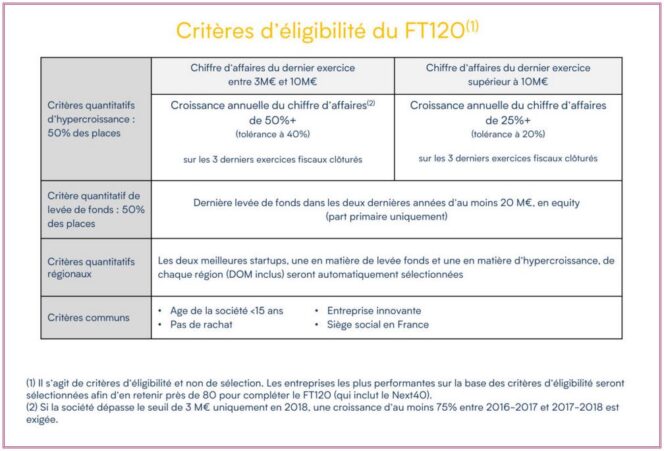 Après le lancement il y a un mois du Next40, qui réunit 40 startups françaises à fort potentiel, voici le FT120. A l’image de l’indice boursier SBF 120, il va ajouter les 80 meilleures startups aux 40 déjà sélectionnées sur la base de deux critères principaux : la levée de fonds ou l’hyper-croissance. Il est possible de postuler pour y apparaître dès aujourd’hui en vous rendant sur ce lien. Il vous faudra pour cela respecter les critères d’éligibilité fixés ci-dessous. 50% des places seront attribuées en fonction du chiffre d’affaires, avec des conditions qui diffèrent selon son montant. Plus celui-ci est élevé, moins la croissance demandée est forte : 50% (voire 40%) si le CA est de 3 à 10 millions d’euros, 25% (voire 20%) au-dessus, sur les trois derniers exercices fiscaux. L’autre moitié des places se fera sur la base des levées de fonds : au moins 20 millions d’euros en equity lors des deux dernières années. Bpifrance et la mission French Tech traiteront les candidatures en décembre, avant le dévoilement des membres du FT120 en janvier 2020.