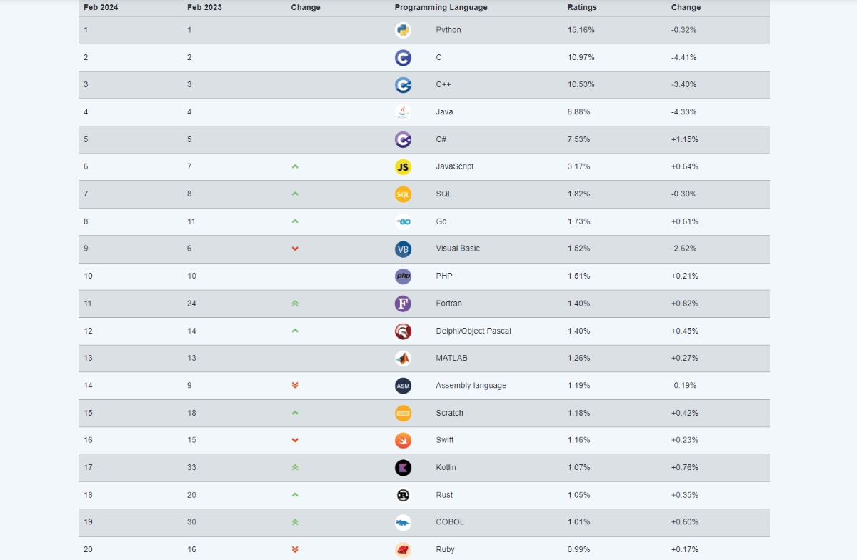 Go bénéficie notamment de la chute de l’Assembly language, qui est passé de la 9e à la 14e place en un an, ainsi que de Visual Basic, qui a perdu trois places durant la même période. Cependant, certains langages ont également connu une remontée significative depuis février 2023, leur permettant d’intégrer le top 20. C’est le cas de COBOL, qui grimpe de la 31e à la 20e place, de Kotlin, passant de la 25e à la 17e place, et de Fortran, qui s’élève de la 27e à la 12e place. Avec une évolution de +0,82 % en un an, Fortran est le langage qui a connu la meilleure progression.