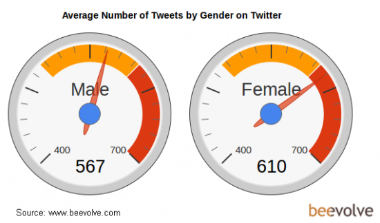 Il semblerait que les femmes tweetent en moyenne plus que les hommes sur le réseau social. Elles ont également plus nombreuses, comme on l’a vu plus haut. Peut-être parce qu’elles ont plus compris l’intérêt de Twitter et qu’elles savent mieux l’utiliser ?