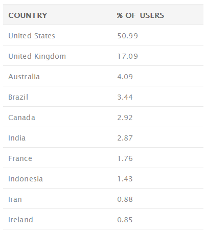 D’où viennent les utilisateurs ? En majorité des Etats-Unis (50,99%). Mais aussi du Royaume-Uni (17,09%) et d’Australie (4,09%). Selon l’étude, la France serait 7ème avec 1,76% des utilisateurs.