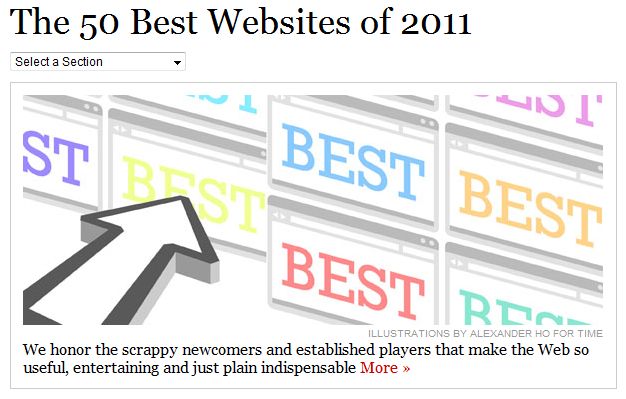 C’est devenu une habitude : depuis 2005, le magazine Time dresse la liste des 50 meilleurs sites Internet de l’année. Le palmarès 2011 vient d’être dévoilé. Plusieurs catégories sont honorées : musique et vidéo, famille et enfants, sports, médias sociaux, actualité, finances, shopping et voyages, santé, jeux et enfin éducation; La liste du Time n’a pas forcément vocation à récapituler uniquement tous les services qui ont bien marché ou beaucoup fait parler d’eux ; au contraire, le magazine cherche à « honorer les nouveaux venus un peu brouillon et les acteurs bien installés qui rendent le Web si utile, divertissant et tout simplement indispensable. » On ne s’étonnera donc pas de trouver dans la liste des sites méconnus côtoyant des sociétés plus célèbres.