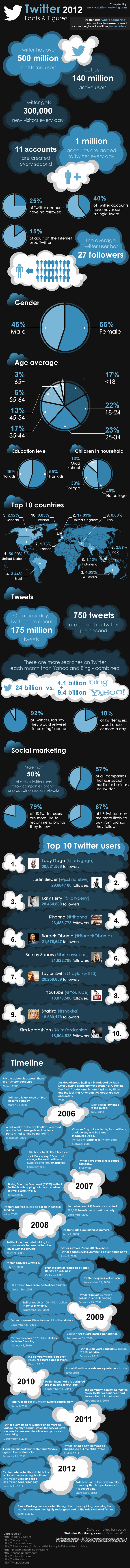 Basée sur de nombreux chiffres et études, l’infographie nous apprend que seul 140 millions de comptes sont actifs sur les 500 millions d’inscrits. Cela reste honnête. D’autant que 1 million de comptes sont créés chaque jour. En moyenne, un utilisateur a 27 followers. L’utilisateur type est une femme âgée de 25 et 34 ans,américaine, avec des enfants. Notons que la France arrive en septième position des pays utilisateurs, pas mal ! Les jours de pointe, c’est pas mal de 175 millions de tweets qui sont publiés. Et c’est toujours Lady Gaga la plus populaire sur le réseau, devant Justin Bieber.