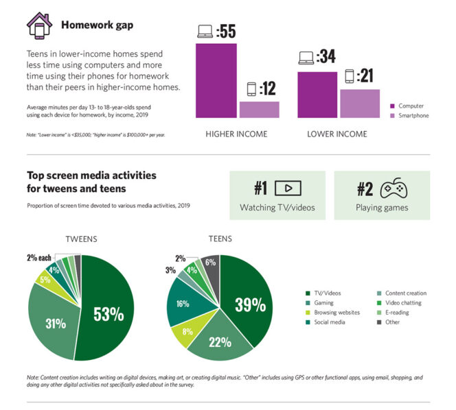 Une étude du média à but non lucratif Common Sense tire la sonnette d’alarme : l’usage des technologies varie selon la classe sociale et les revenus d’un foyer. Cette conclusion se base sur un panel de 1 600 jeunes américains âgés de 8 à 18 ans, classés en deux catégories : les « tweens » (8 à 12 ans) et les « teens » (13 à 18 ans). Elle s’intéresse à leur consommation de médias au sens large, des livres à la radio en passant par les médias sociaux. Elle s’intéresse également à l’évolution des pratiques entre 2015 et 2019.