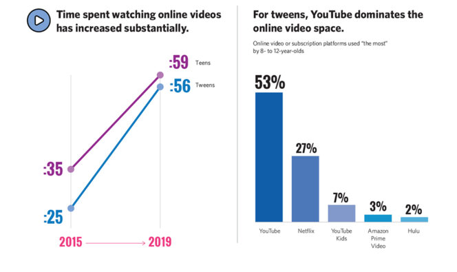 La moyenne du temps d’écran quotidien observée en 2019 est gigantesque : 4h44 par jour pour les tweens, 7h22 pour les teens. Et cela n’inclue pas les usages en lien avec l’école ou les devoirs, uniquement les temps de loisirs… C’est 4 minutes de plus qu’en 2015 pour le premier groupe, 42 minutes de plus pour le deuxième. S’il s’agit d’une moyenne, la surconsommation est tout de même généralisée, 62% des teens passant ainsi plus de 4 heures par jour devant un écran. Le reste des médias est beaucoup moins élevé : 1h10 pour les tweens, 2h27 pour les teens.