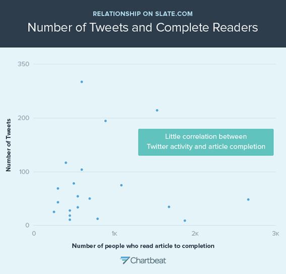 Une autre étude appuie encore ce constat, cette fois par Slate, toujours aux États-Unis. Avec l’aide de Chartbeat, un cabinet d’étude statistique, les habitudes des utilisateurs ont été analysées. Ainsi, les statistiques de scroll de la page et de taux de rebond ont été corrélées avec le nombre de partages sur Twitter. On se rend alors vite compte que beaucoup de gens ne scrollent même pas la page avant de la quitter et que la plupart des visiteurs partagent des articles en ayant lu seulement quelques lignes.
