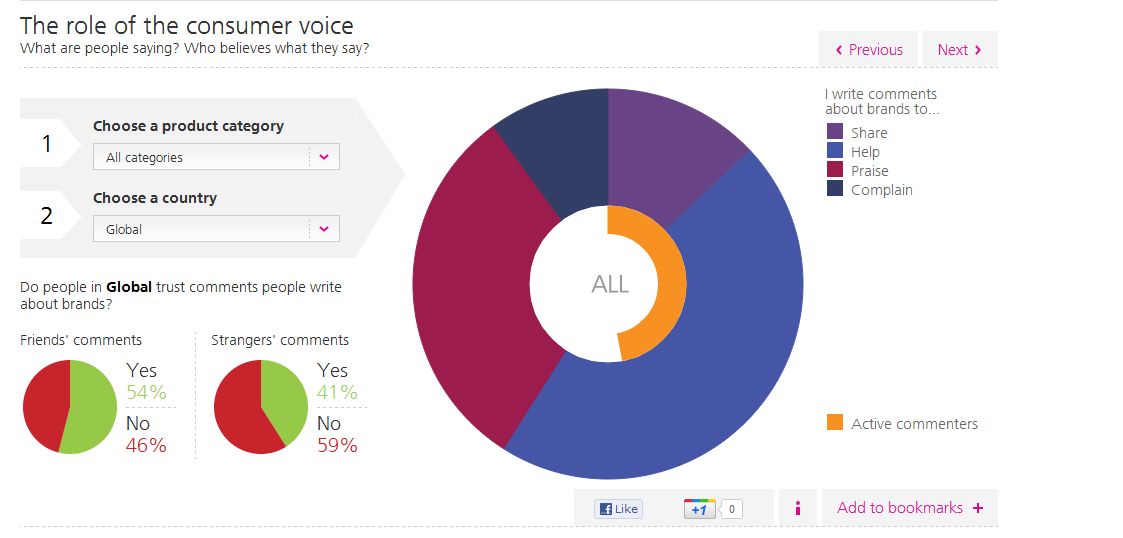 Quand il s’agit de parler d’une marque, en bien ou en mal, les internautes sont assez actifs. Presque la moitié (47%) d’entre eux écrivent des commentaires, sur tout type de supports, à propos de produits. Les raisons en sont variées : 13% pour partager, 46% pour aider les autres, 31% pour faire les éloges de la marque, et seulement 10% pour s’en plaindre. Cette dernière part est beaucoup moins importante que les autres, mais à ne pas négliger toutefois, il ne faudra pas oublier que plus de la moitié des internautes font confiance à ce que de parfaits étrangers écrivent à propos d’une marque, soit la même proportion que la valeur accordée aux commentaires de leurs amis.