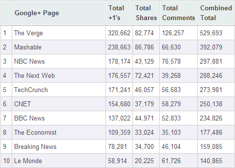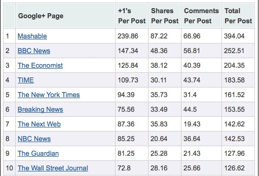 En se penchant sur les chiffres, on constate d’ailleurs le faible intérêt de certains médias pour G+ : Bloomberg News et The Telegraph n’ont plus posté depuis juin 2012 et le dernier post de CBS News date de septembre. CNN, le principal média américain est quant à lui totalement inactif depuis près d’un an. Visiblement certains médias n’exploitent pas encore pleinement les possibilités offertes par G+.