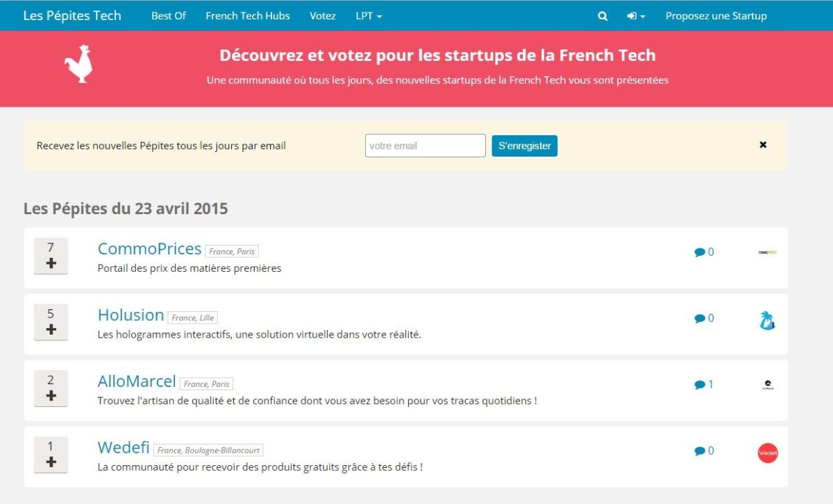 Vous connaissez sûrement le site Product Hunt qui propose de voter chaque jour pour les meilleurs projets, sites, apps ou start-up via un système d’up-votes. La French Tech a maintenant son Product Hunt Like qui présente les meilleurs projets de l’écosystème start-up français : Les Pépites Tech. Le principe du site est simple, les utilisateurs peuvent soumettre des start-up françaises et voter pour les projets les plus séduisants. Les commentaires sont pour l’instant réservés aux membres vérifiés, tous identifiés comme faisant partie de l’univers web français.