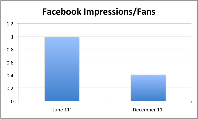 Ce chiffre s’explique notamment par l’accroissement du nombre de pages dont les membres de Facebook sont fans, mais aussi par le peu de feedbacks que certains reçoivent. Moins il y a de likes et de partages, et moins vous serez visibles. Les implications sont nombreuses. Non seulement votre nombre de fans ne signifie rien, mais vous devrez aussi multiplier par 6 le coût d’acquisition d’un vrai fan. Autrement dit, vous paierez pour des fantômes dans la grande majorité des cas… Autre chiffre déprimant, le nombre moyen d’impressions par fan de vos messages. Ce dernier est en forte baisse ces derniers mois, passant de 0,99 en moyenne en juin 2011 à seulement 0,41 en décembre. Soit une baisse de 58%…