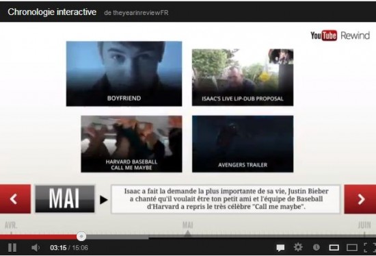 Si vous n’arrivez pas à trouver les nombreuses références qui émaillent la vidéo-rétrospective, vous pouvez cliquer sur les carrés qui apparaissent afin de visionner la vidéo originale. En plus de cette vidéo, Youtube a mis en ligne une frise chronologique interactive retraçant les moments forts de l’année 2012. Entre moments insignifiants à la surprenante viralité et vrais instants historiques, vous pourrez revivre toute l’année écoulée.
