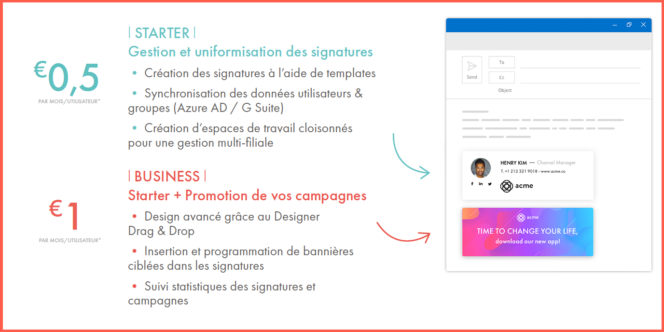 L’offre Business coûte 1€ par compte et par mois et permet de créer des signatures from scratch, la planification de bannières marketing, l’accès aux statistiques, le multi-signatures, et les créations de mails de réponse et de transfert allégés.