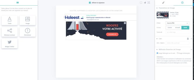 Vous avez évidemment le choix des attributs à intégrer dans les signatures : prénom, nom, fax (pourquoi pas !), ville, société… Vous pouvez aussi intégrer des images aux signatures si vous le souhaitez afin de les rendre plus visuelles, ainsi que plusieurs profils sociaux (Facebook, Twitter, LinkedIn, Instagram, WhatsApp, Medium…).