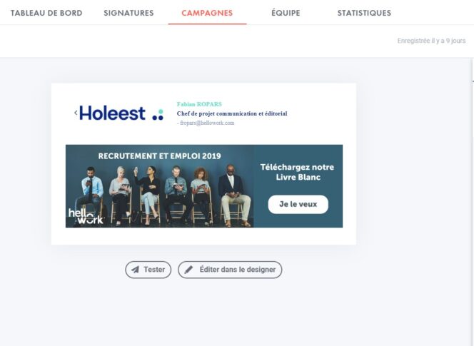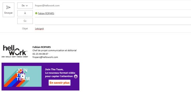 En 2 clics, vous avez alors une signature normalisée pour toute l’entreprise, que vous pouvez gérer de façon totalement décentralisée. Dans le cas d’HelloWork, nous avons ainsi créé plusieurs signatures aux couleurs des différentes marques pour lesquelles travaillent les collaborateurs. La gestion multi-logo et multi-signatures est aussi un vrai plus pour les grands comptes. Il peut par exemple arriver de travailler pour plusieurs marques, au sein de la même entreprise.