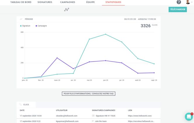Des statistiques sont disponibles pour chaque campagne avec le nombre de clics, le nombre d’envois, etc. Vous avez aussi accès aux statistiques par équipe, ou par collaborateur afin d’analyser les niveaux de performances.