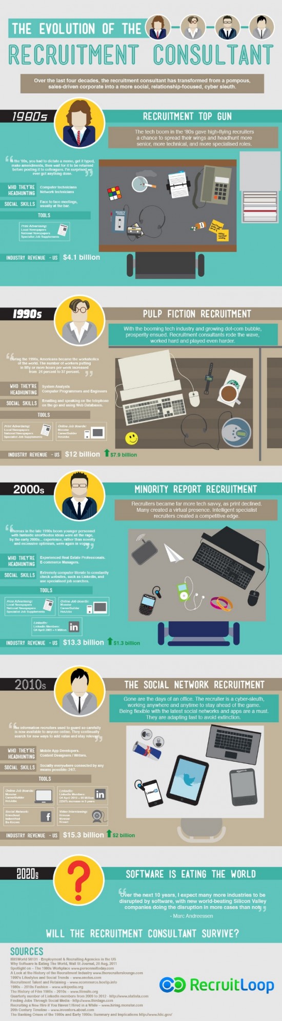 Les temps changent, les outils aussi ! En seulement quelques années les techniques employées par les chasseurs de têtes et cabinets de conseil en recrutement ont évolué, notamment sous l’effet du déploiement des technologies de l’information et d’Internet. Des changements résumés dans cette infographie de RecruitLoop, un cabinet de recrutement australien. Entre les années 80, l’âge du « recrutement Top Gun », les années 90 avec le recrutement « Pulp Fiction », les années 2000 et le « Minority Report Recruitement » jusqu’à notre décennie des années 2010 marquée par une évolution du recrutement sous l’angle du « Social Network », cette infographie montre le changement dans le métier de recruteur, au niveau des outils, des profils les plus recherchés et des compétences sociales…