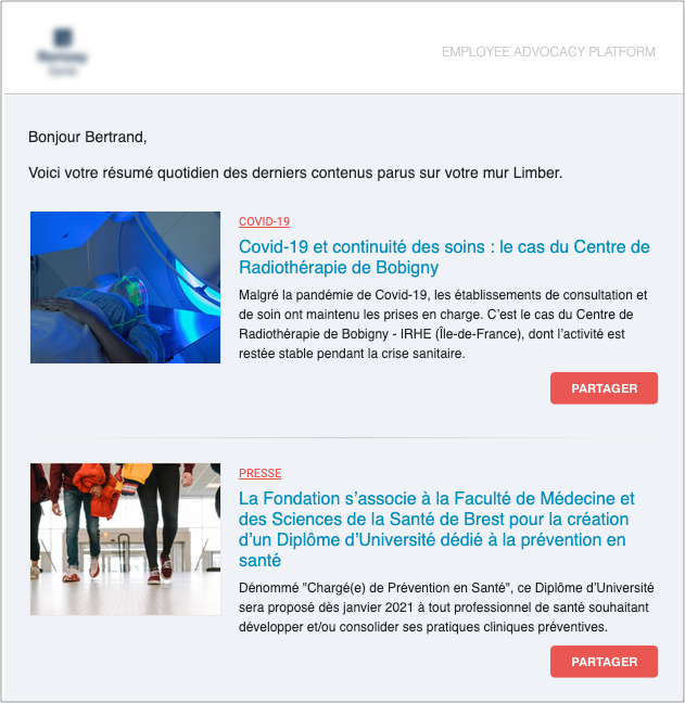 Pour éviter cela, Limber propose la mise en place de newsletters automatiques, qui offrent un accès rapide et simple à l’ensemble des contenus pour tous les utilisateurs. Toutes les données importantes sont incluses dans la newsletter, et elle permet de faciliter les partages sociaux. Il suffit de cliquer sur les boutons de partages intégrés pour partager n’importe quel contenu. Comme pour les murs de contenus, si votre entreprise publie peu de contenus elle-même, ces newsletters sont un excellent moyen d’alimenter les salariés et d’en faire des ambassadeurs. Les newsletters sont totalement personnalisables. Vous pouvez utiliser les templates Limber, ou importer directement dans Limber un template HTML. Elles peuvent être générées de façon manuelle, semi-automatisée, ou totalement automatisée.