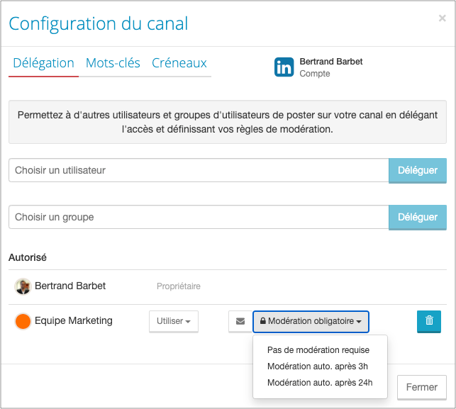 Vous pouvez pour cela demander l’accès aux comptes sociaux (LinkedIn, Twitter, Facebook…) de vos ambassadeurs, et partager du contenu automatiquement sur leurs comptes sociaux. Plusieurs options de modération sont disponibles pour que les contenus soient validés par le collaborateur, avant un post automatisé. Une fonctionnalité parfaite éviter les « oublis » des collaborateurs, qui n’ont pas toujours le temps de partager les contenus.
