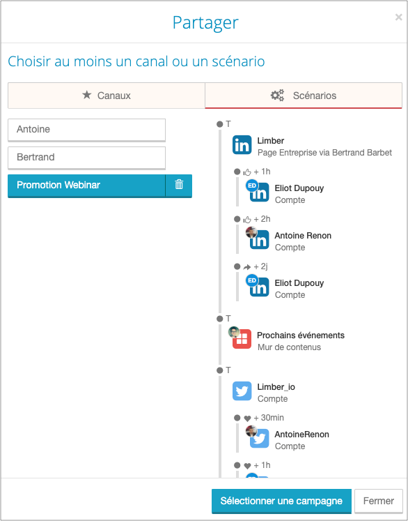 Autre gros point fort de Limber : la possibilité de créer des scénarios de publication complexes. Vous pouvez créer autant de scénarios que nécessaire et ajouter autant de canaux de diffusion que vous voulez : pages de l’entreprise, profils des collaborateurs, newsletters Limber… Vous pouvez enregistrer tous vos scnéarios, et les attribuer à vos nouveaux contenus.