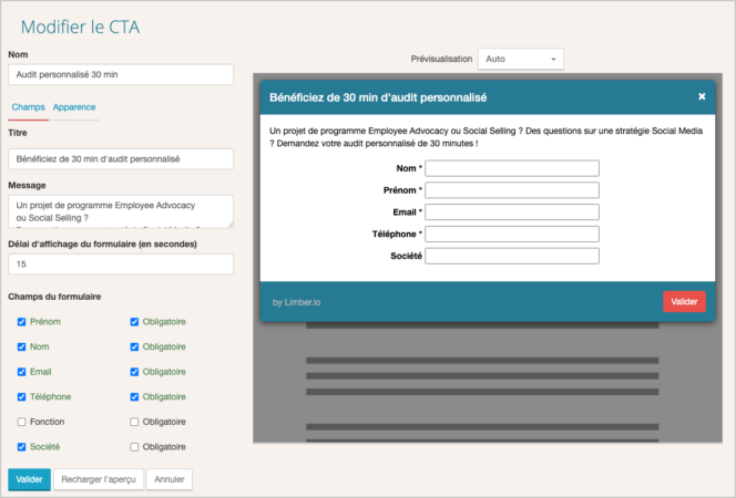 Limber propose aussi la création et l’implémentation de CTA sur tous vos contenus pour pouvoir mesurer leurs performances. En quelques clics, vous pouvez insérer un CTA sur votre contenu, mais aussi sur des contenus tiers. Les CTA permettent l’implémentation et le tracking de boutons, formulaires ou liens vers des landing pages… Cela vous permet de capitaliser sur les contenus partagés, et de récolter du lead, même en partageant des contenus tiers, grâce à votre curation et aux partages de vos collaborateurs.
