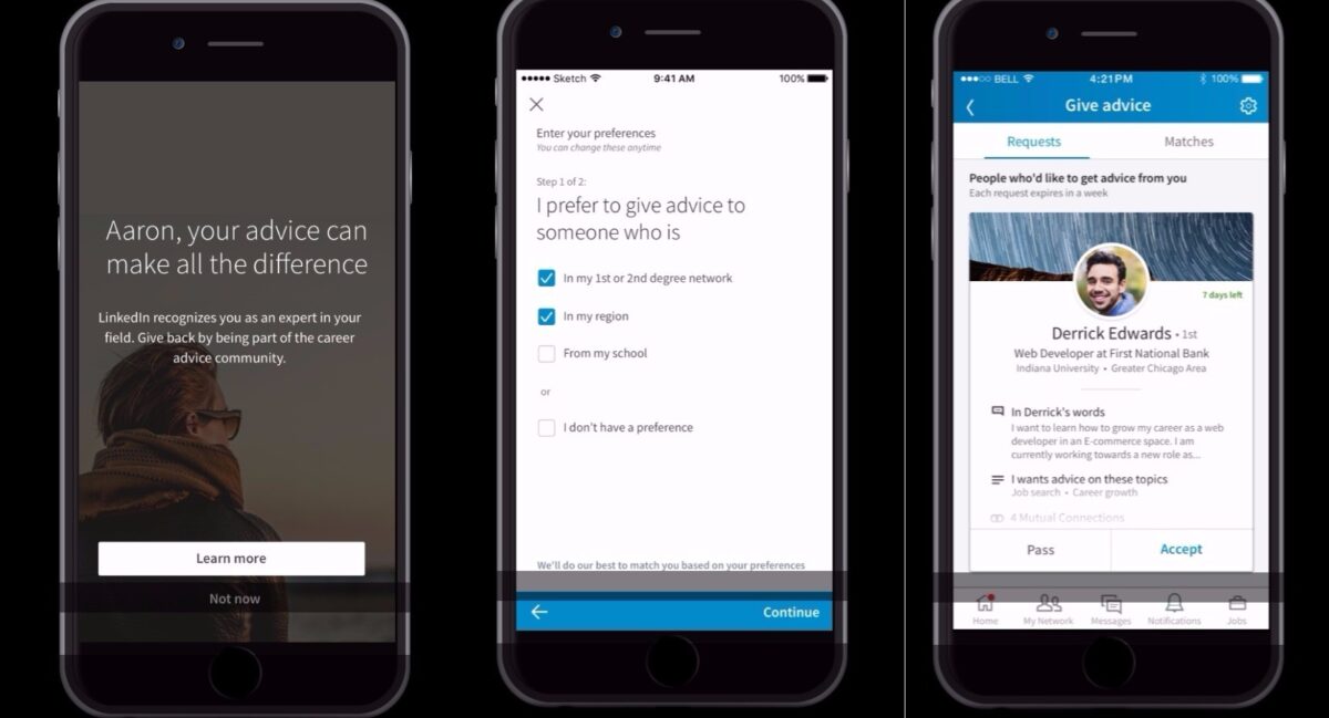 La possibilité de mentorer sera ouverte à tout le monde et ne se concentrera donc pas sur les utilisateurs « influenceurs ». Il sera ensuite possible de choisir qui l’on souhaite aider : 1er ou 2nd cercle LinkedIn, utilisateur de la même région, utilisateur de la même école… Côté utilisateur en recherche de mentoring, il suffira d’indiquer qu’on recherche des conseils sur tel ou tel sujet. Selon les critères de recherches, LinkedIn fournira une liste de mentors potentiels. Mentors et utilisateurs en recherche pourront alors « matcher » sur le même principe que Tinder (avec une finalité bien différente néanmoins).