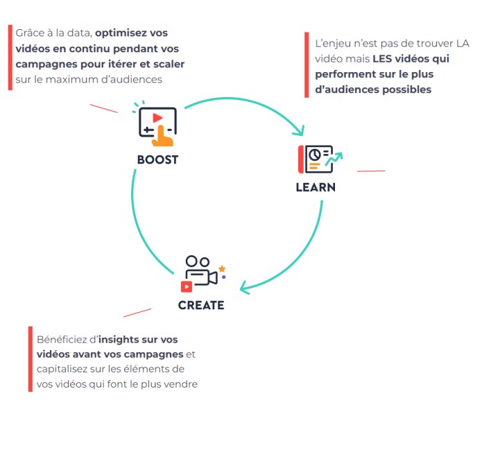 Grâce au machine learning la solution vous permet de produire et d’optimiser des milliers de combinaisons. La démarche de « Creative Loop » permet d’analyser rapidement les éléments créatifs qui ont le plus d’impact sur le clic ou la conversion pour les réinjecter dans de nouvelles versions de vidéos.
