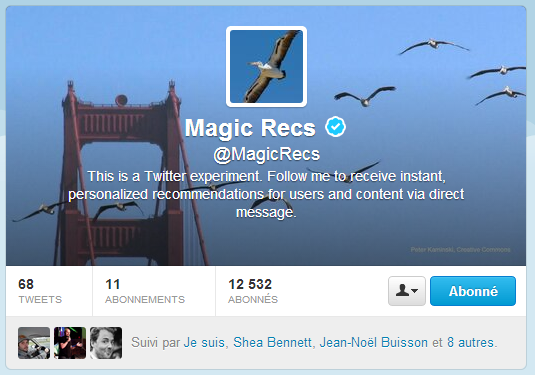 Le New York Times vient de rendre public une expérimentation menée par Twitter de façon plus ou moins « officielle » : Magic Recs. Derrière cette abréviation (Magic Recomendations) se cache un compte Twitter actif depuis le mois de juin et qui vous envoie des DM mentionnant des personnes et comptes que vous seriez susceptible de vouloir suivre. Ces recommandations sont personnalisées et basées sur votre activité récente sur le réseau de micro-blogging.