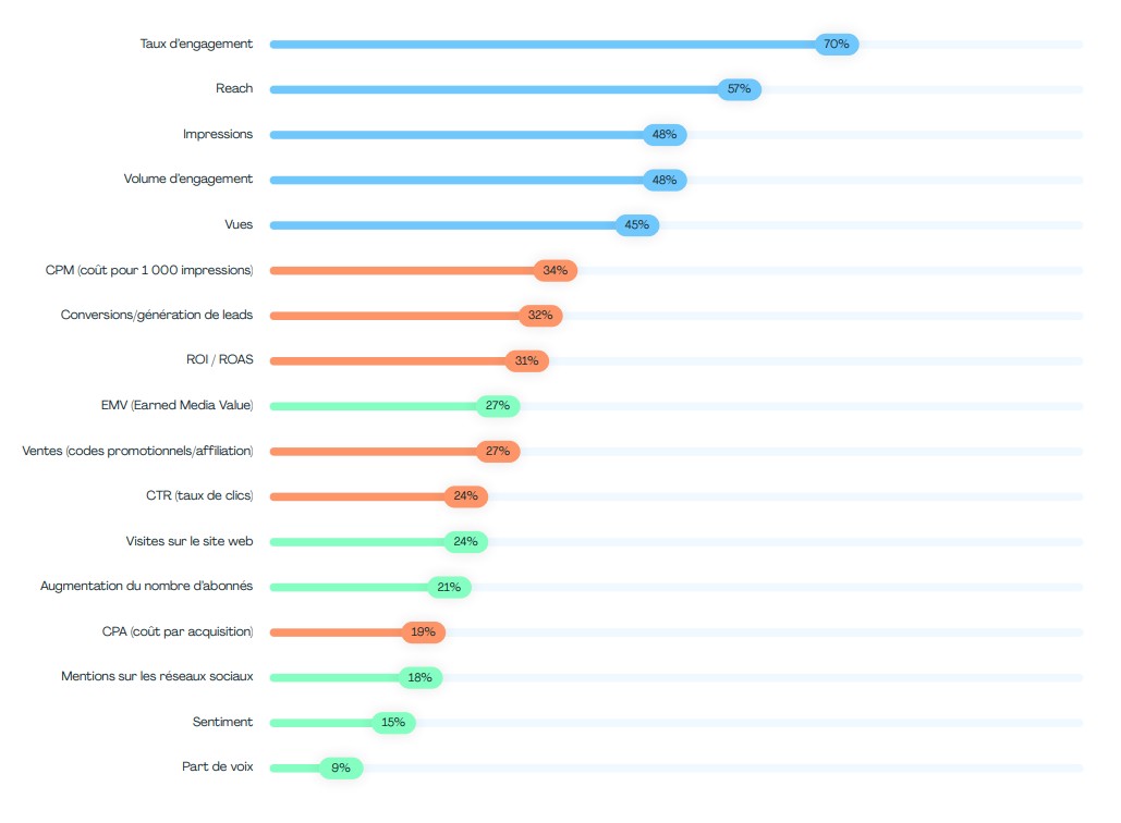 Autre constat clair de l’étude : les marques sont en recherche d’engagement et de portée, qui concernent les 5 KPI les plus suivis :