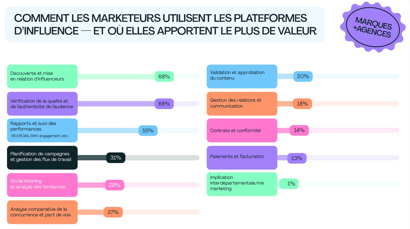 De leur côté, les plateformes d’influence séduisent près de 4 entreprises sur 10. Un chiffre relativement élevé, d’autant plus que 15 % des répondants affirment travailler avec une agence qui utilise ses propres outils. Les 3 principaux motifs d’usage sont la découverte et mise en relation avec des influenceurs (68 %), la vérification de la qualité et de l’authenticité de l’audience (68 %) et l’accès aux rapports de performance (55 %).