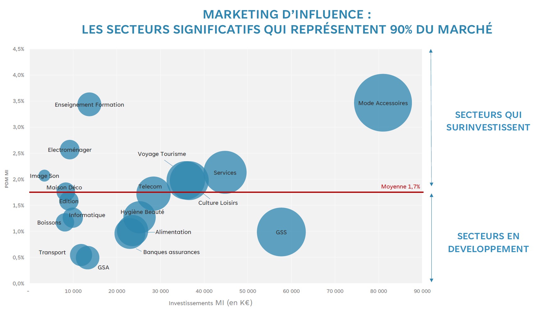 L’étude propose pour la première fois une analyse des investissements par secteur annonceur. Deux dynamiques coexistent : certains secteurs investissent des volumes absolus élevés, tandis que d’autres consacrent au marketing d’influence une part de leur budget communication supérieure à la moyenne du marché (1,7 %). Ces deux logiques ne se recoupent pas nécessairement.